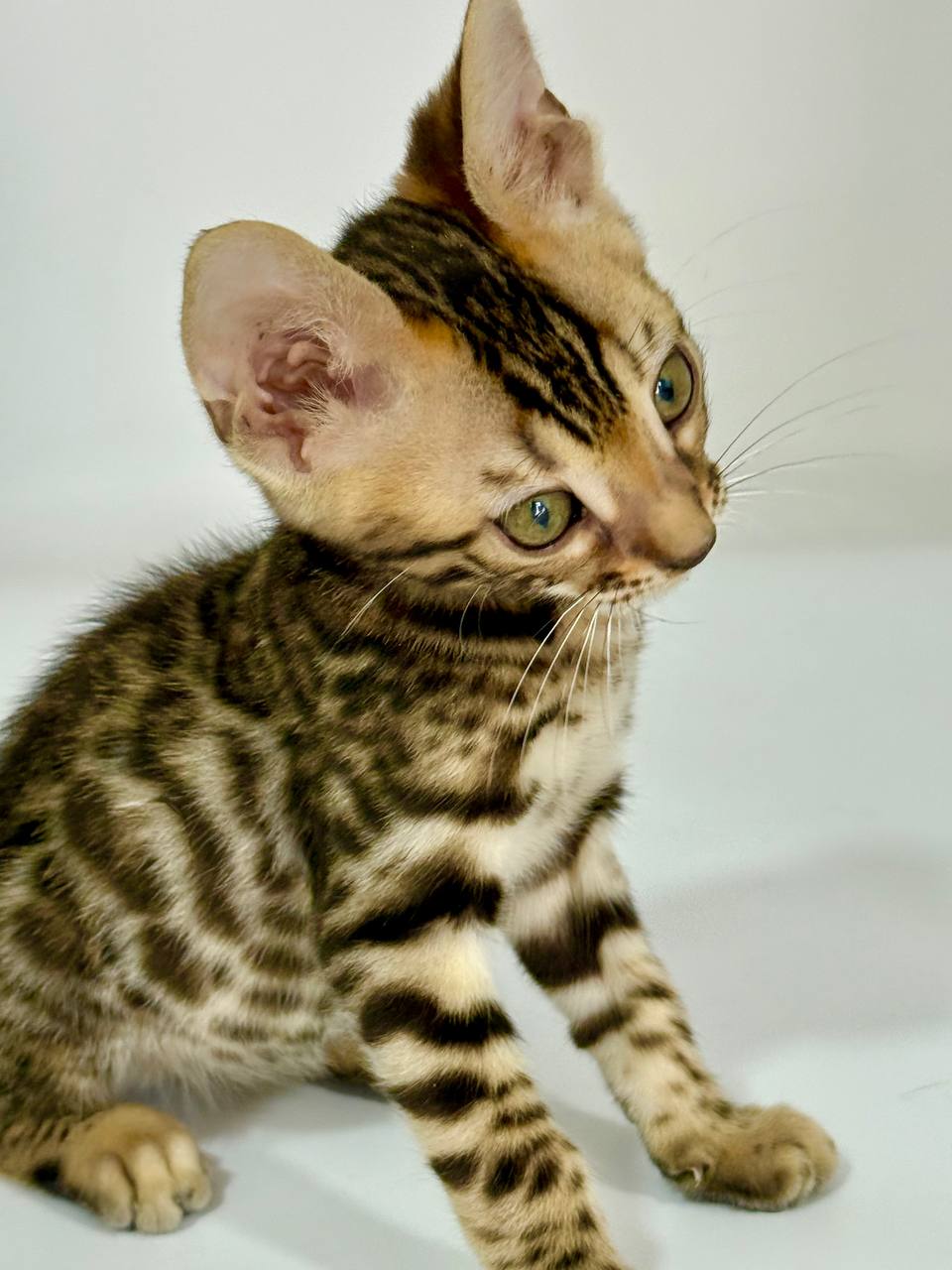 With his mesmerizing green eyes, large ears, and wild-like spotted coat, this little boy is a perfect example of a Bengal kitten. Often mistaken for a miniature leopard, the Bengal cat is a hybrid breed originally developed by crossing domestic cats with the Asian leopard cat. This combination gave rise to a stunning, athletic, and highly intelligent feline companion that has captured the hearts of cat lovers around the world. Our little guy here is already showing off the breed’s distinctive pattern, sleek build, and curious expression—traits that make Bengals truly one of a kind.