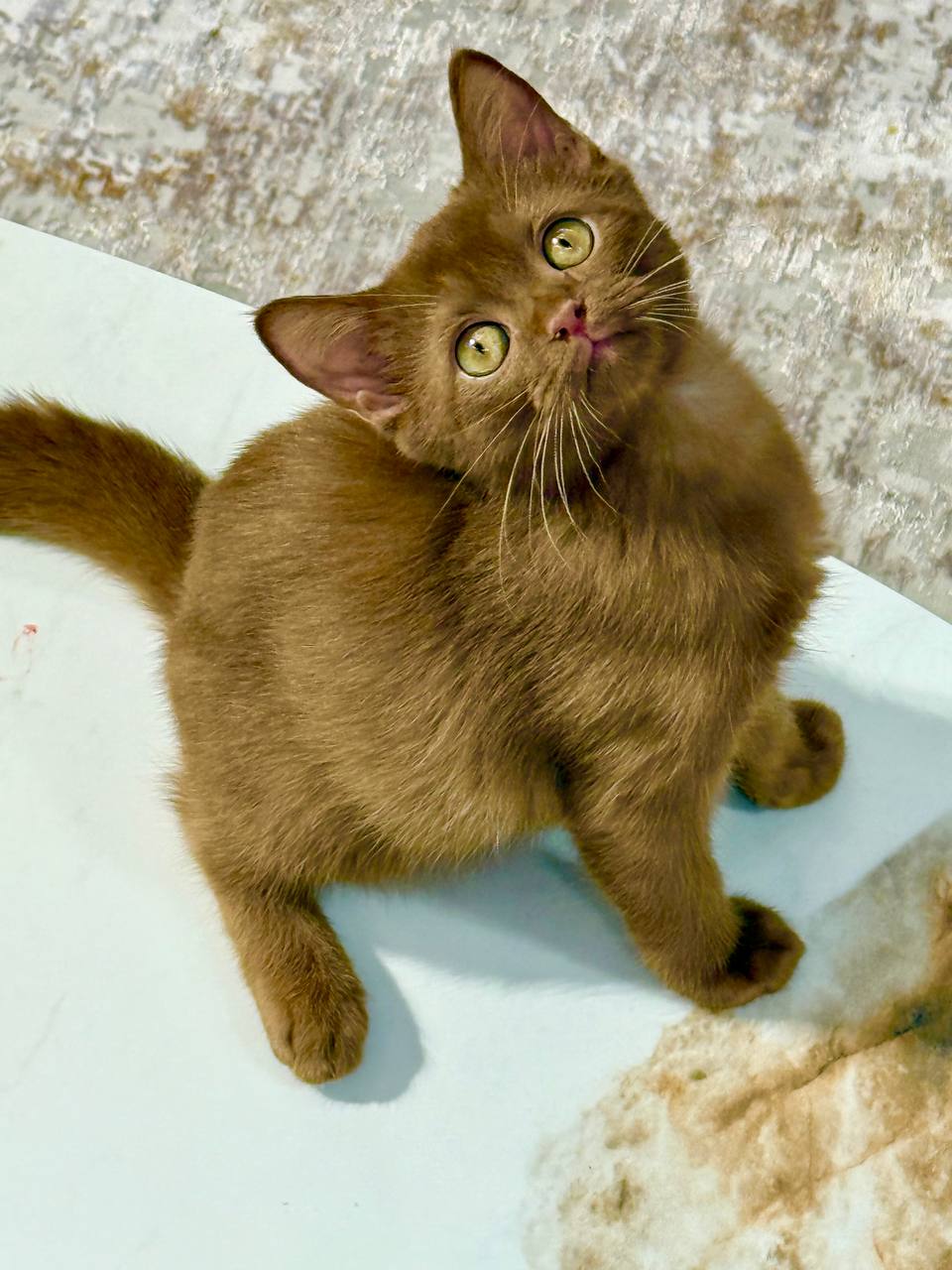 Look at those luminous eyes and that silky chocolate coat—this adorable British Shorthair kitten is the very definition of charming. With his compact body, round face, and curious gaze, he’s already showing the iconic features that make this breed so beloved. His soft fur catches the light with a velvety shimmer, and his expression is a perfect mix of innocence and wisdom. While still tiny now, he’ll grow into a plush, medium-to-large cat known for grace, composure, and warmth. Every glance he gives already hints at a poised personality that will blossom beautifully with time.