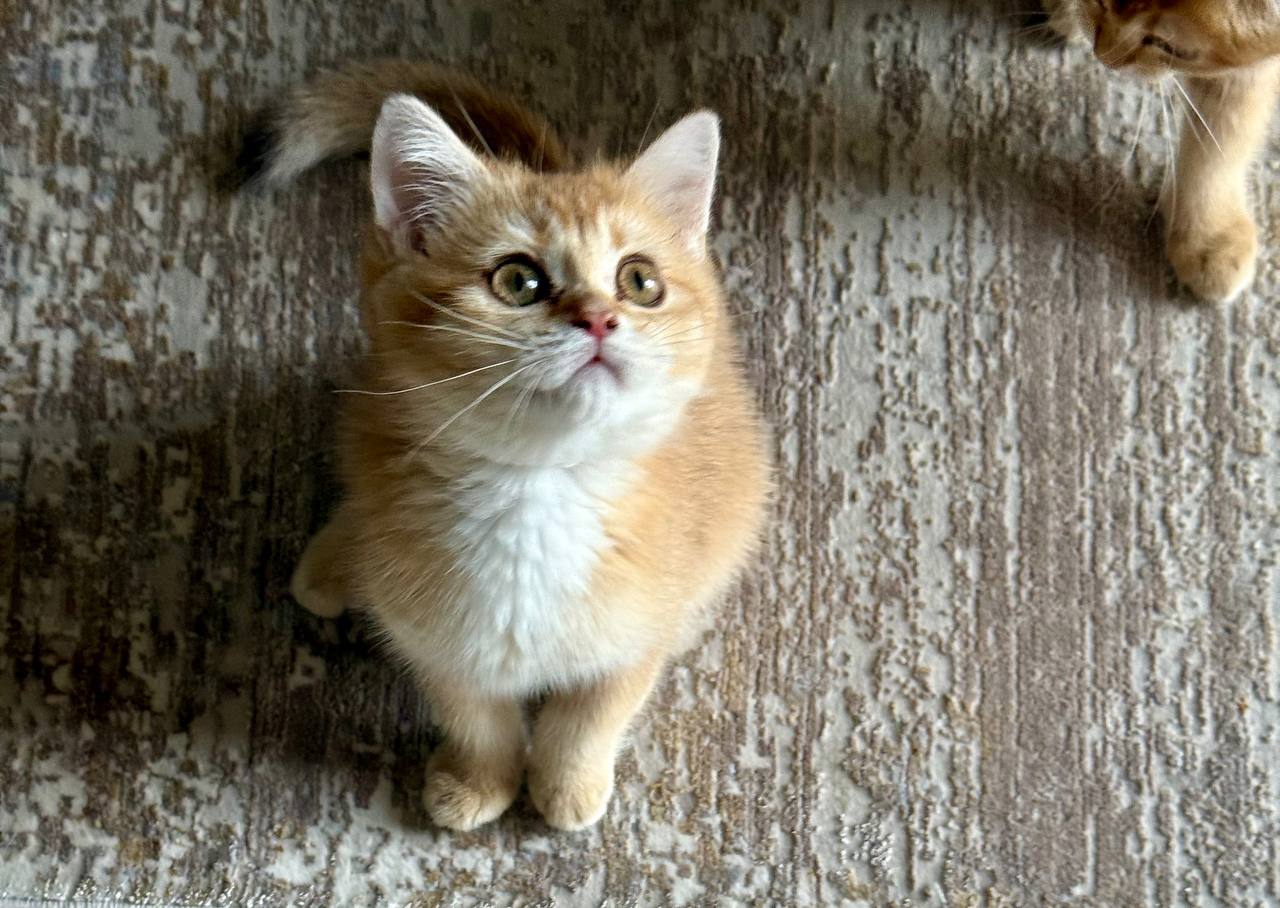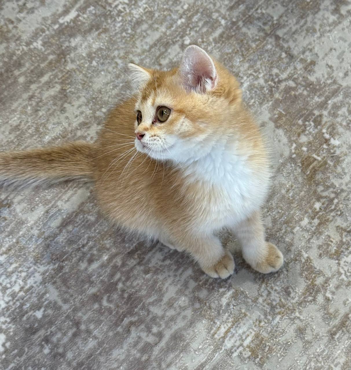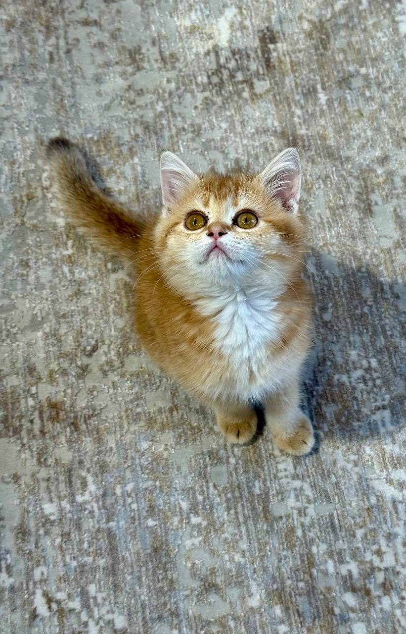 This little golden-brown kitten with soulful eyes and a pristine white chest is a female British Shorthair, one of the most beloved cat breeds in the world. Her round face, expressive amber eyes, and plush coat are hallmark traits of her breed. Even in a single image, she radiates the gentle curiosity and calm nature that define her lineage. While she may be small now, she’s set to grow into a robust, plush-coated cat with a personality as steady as her appearance is charming.