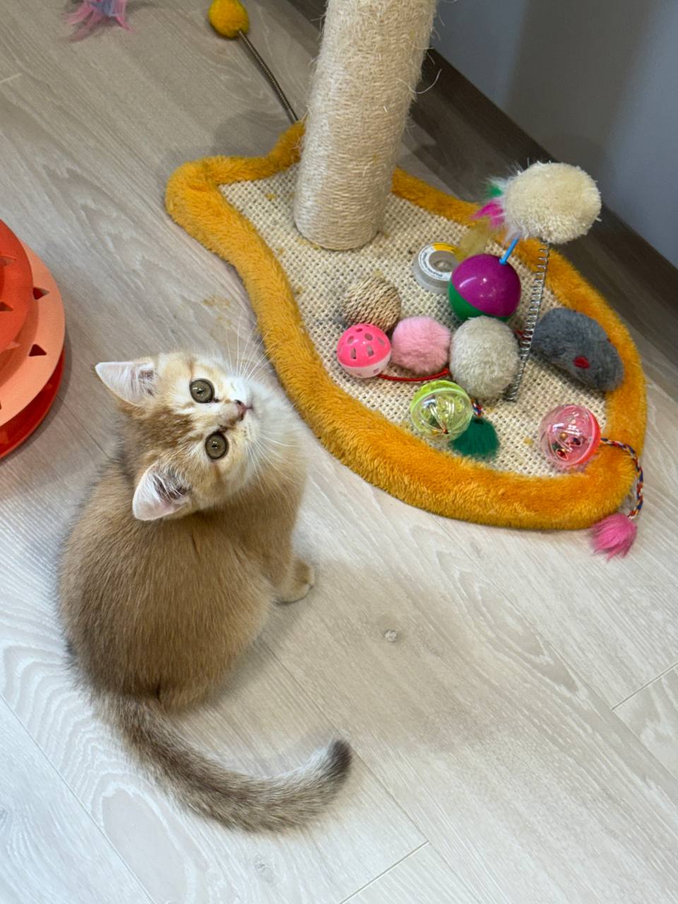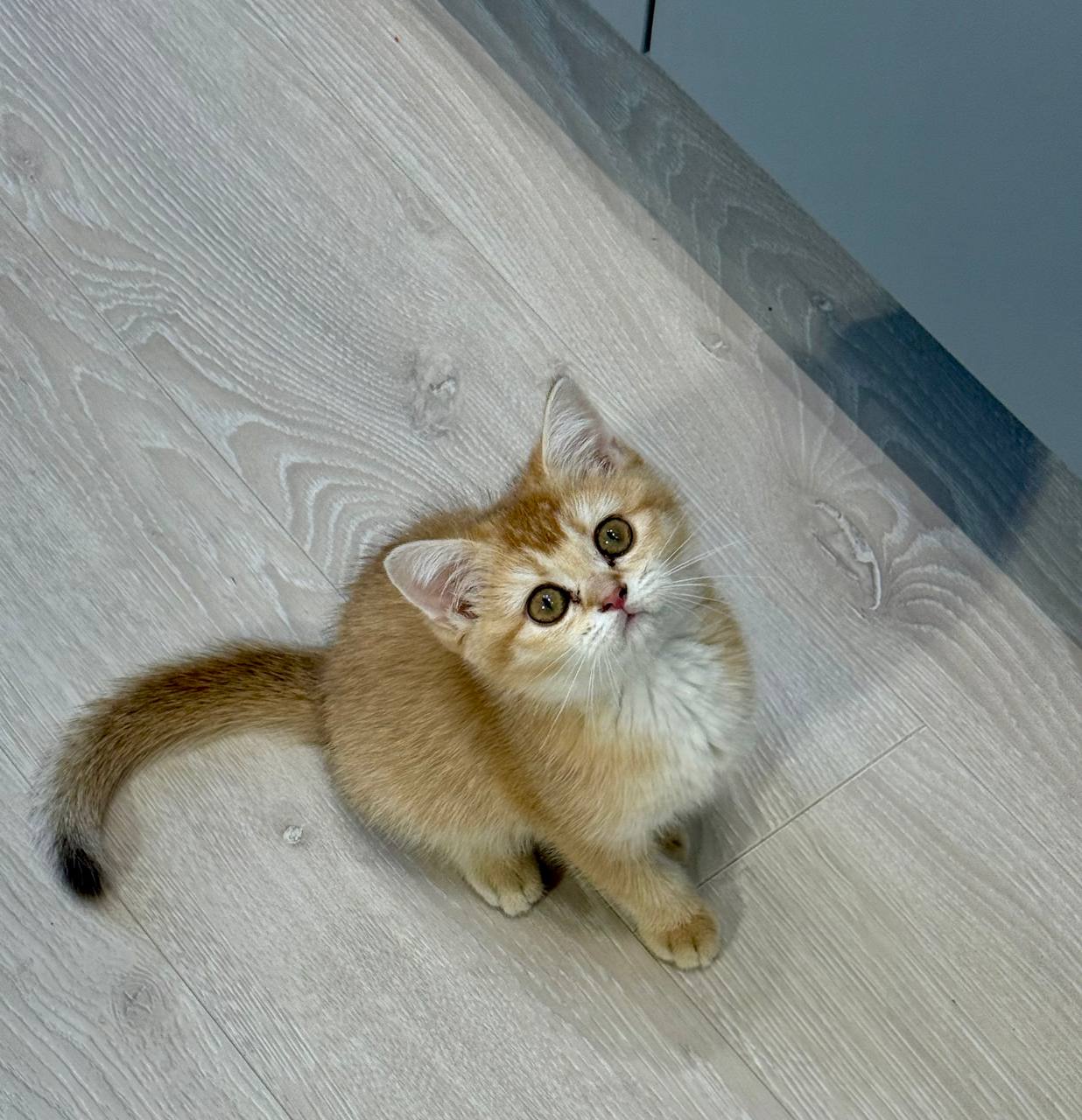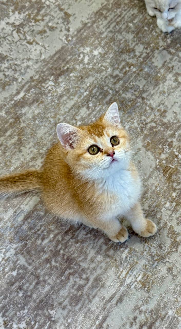 This little golden-brown kitten with soulful eyes and a pristine white chest is a female British Shorthair, one of the most beloved cat breeds in the world. Her round face, expressive amber eyes, and plush coat are hallmark traits of her breed. Even in a single image, she radiates the gentle curiosity and calm nature that define her lineage. While she may be small now, she’s set to grow into a robust, plush-coated cat with a personality as steady as her appearance is charming.
