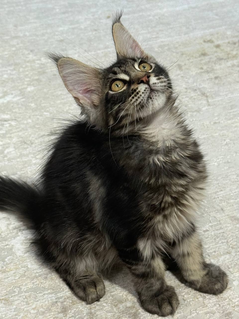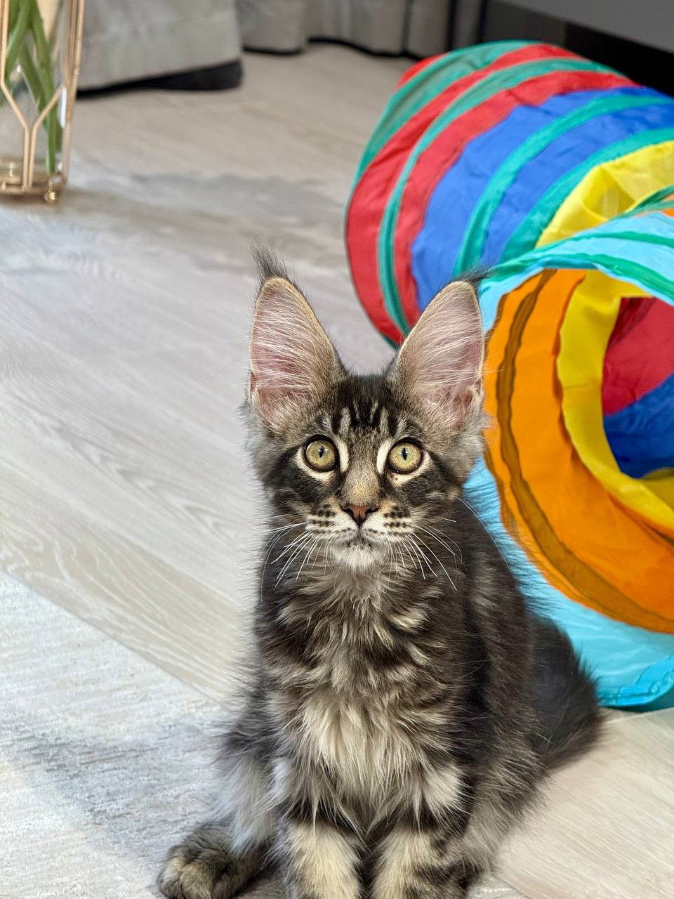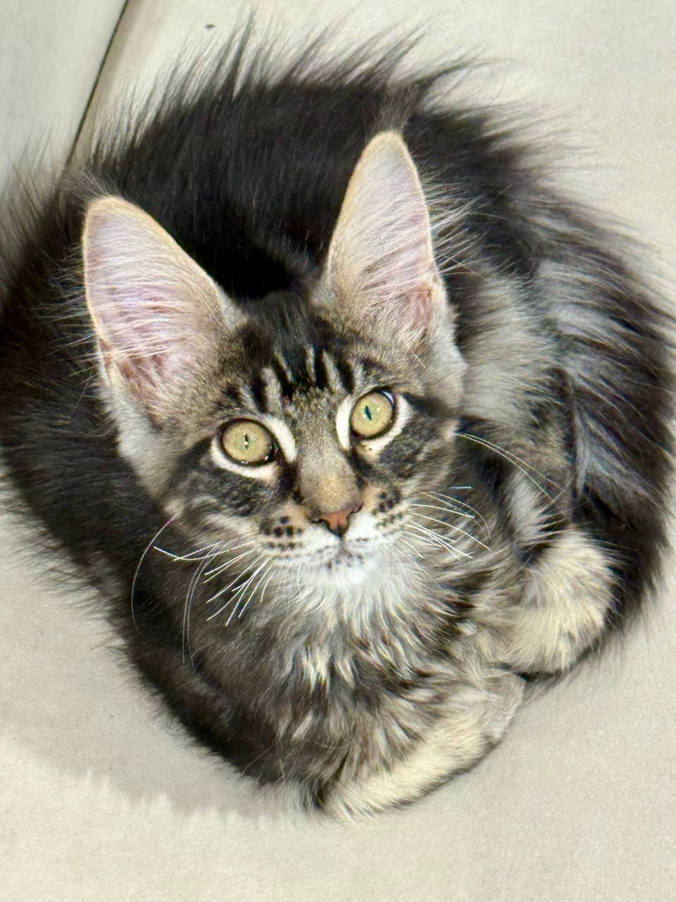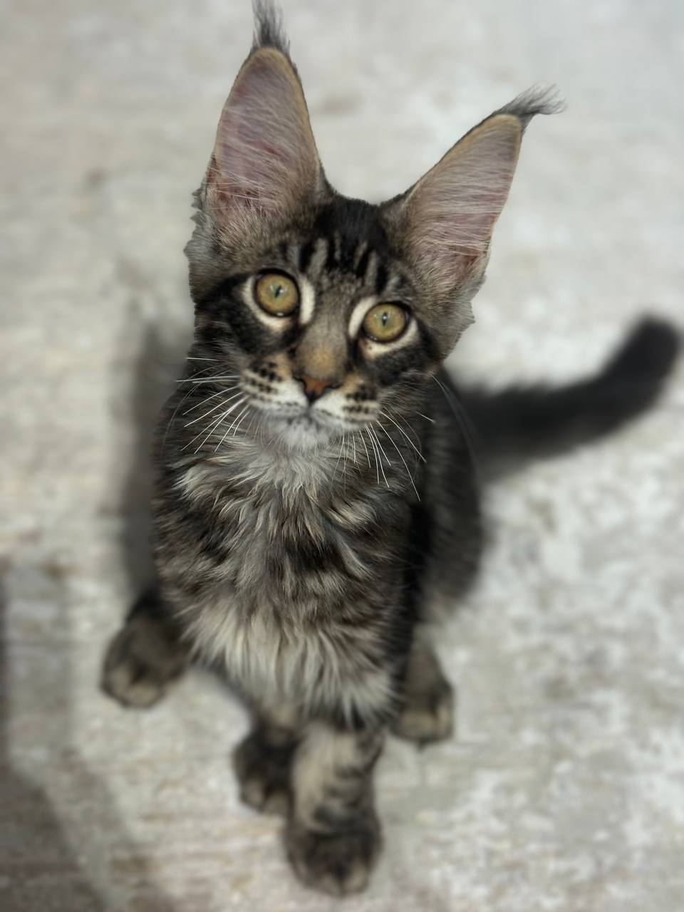 Just look at this stunning kitten! With his big, expressive eyes, striking tabby markings, and those iconic lynx-like ear tufts, this little boy is the picture of everything we love about the Maine Coone breed. He already radiates intelligence and curiosity, and his soft, thick fur hints at the majestic beauty he’ll grow into as an adult. The Maine Coone is one of the most popular cat breeds in the world, and it’s no mystery why. These cats are not only breathtaking in appearance, but also warm, loyal, and full of personality.
