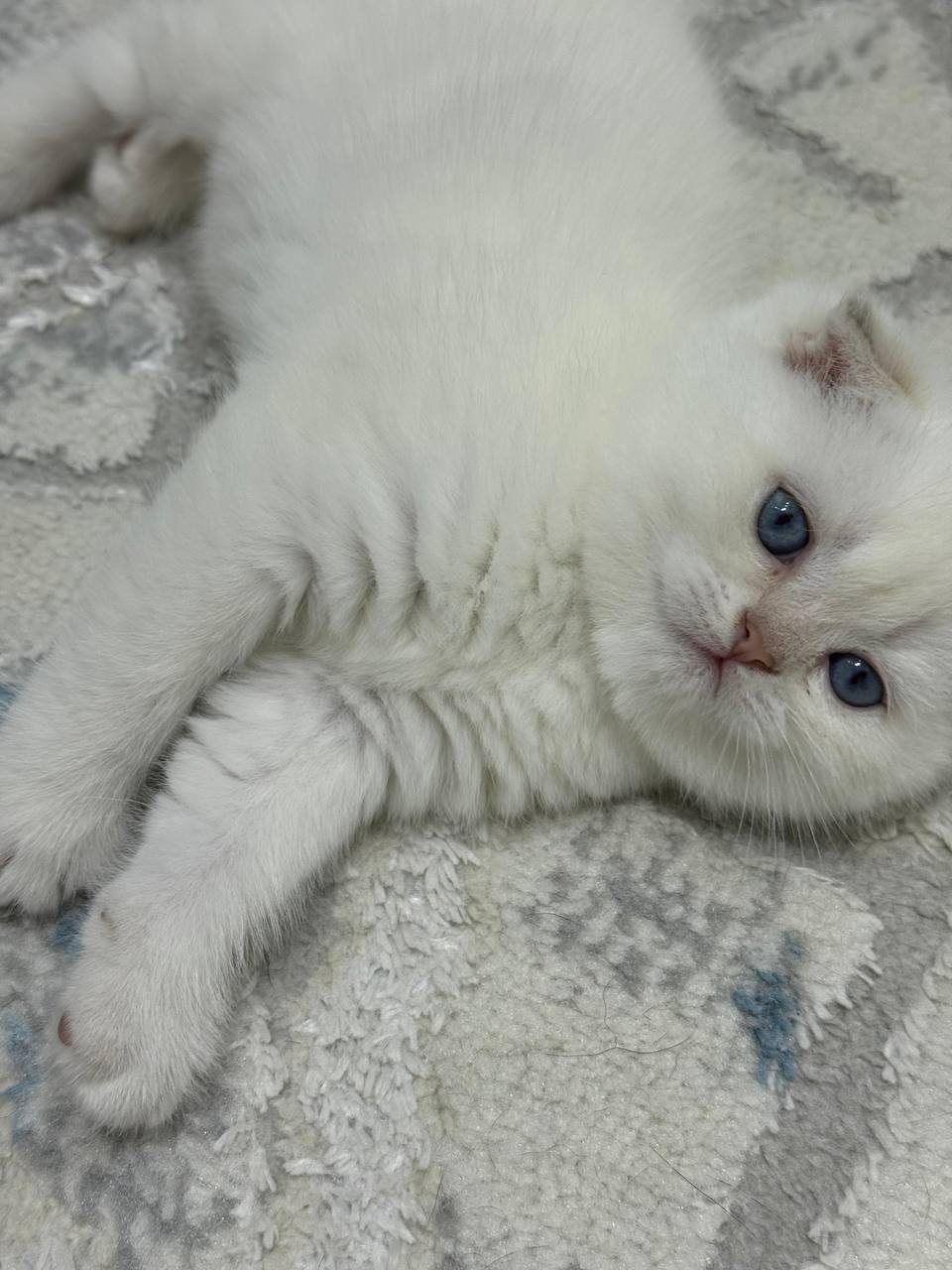The Scottish Fold is a breed that captures hearts instantly, largely due to its distinct “owl-like” appearance. This look is primarily caused by a natural dominant-gene mutation that affects the cartilage in the ears, causing them to fold forward and down toward the front of the head. Beyond their ears, the Scottish Fold is known for having a rounded body, large expressive eyes, and a very dense, plush coat. In Ollie’s case, he boasts a beautiful “white point” coloration. This means he has a predominantly snowy coat with subtle, elegant darker markings on his extremities, such as his ears, tail, and paws. This specific color pattern gives him a sophisticated and ethereal look that is sure to stand out.